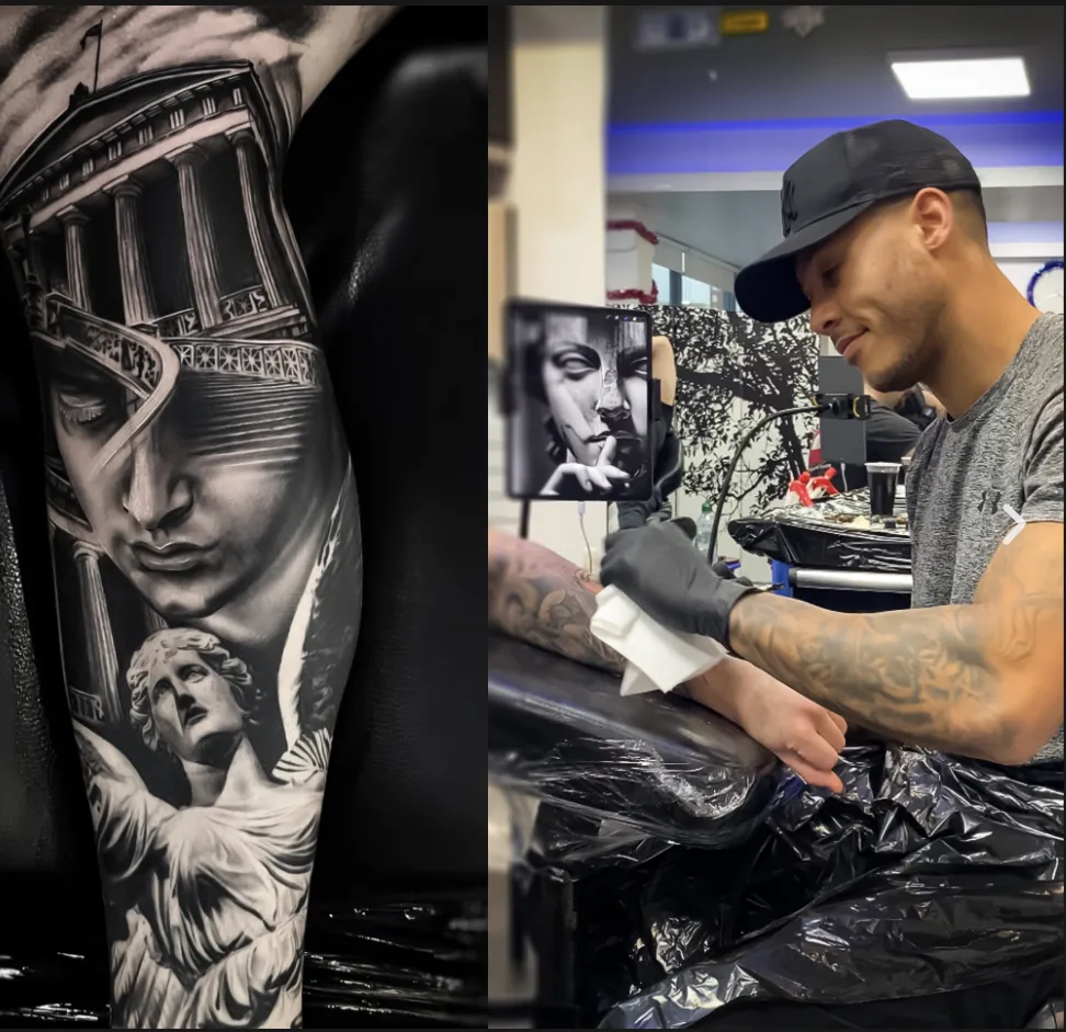 Known for striking black & grey realism, detailed portrait work, and powerful use of light and shadow. He has built a strong reputation through years of dedication, guest spots, and work in respected studios across Europe. His tattoos are highly personalised, transforming individual stories into bold, expressive, and emotionally impactful pieces.
